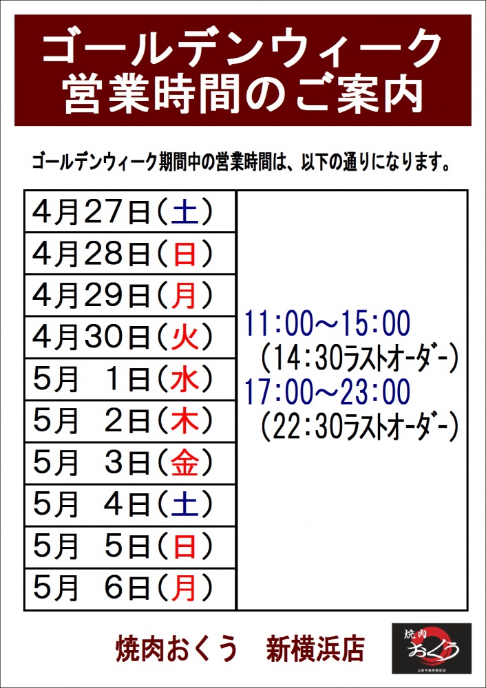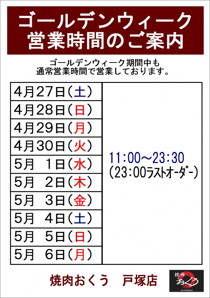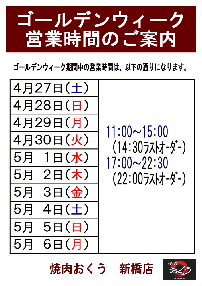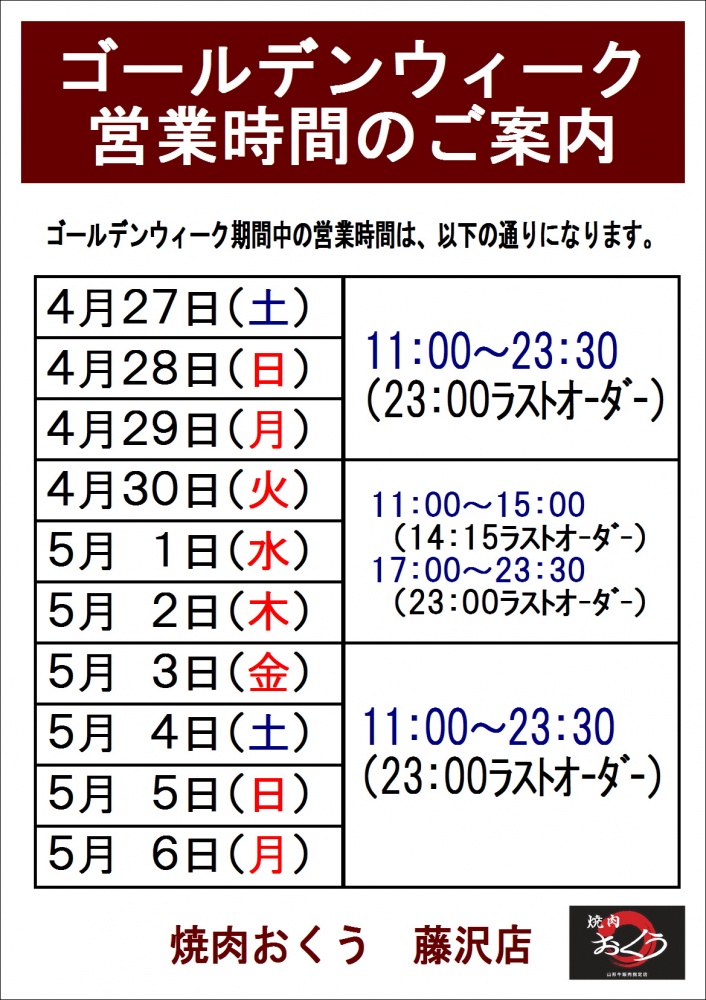 ≪ 2019年 ゴールデンウィーク営業時間のご案内 ≫