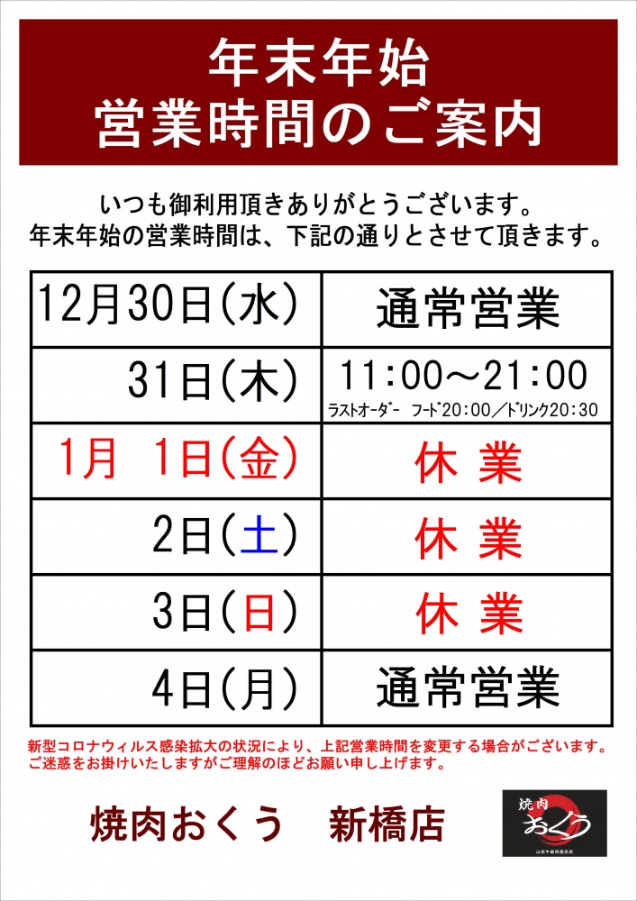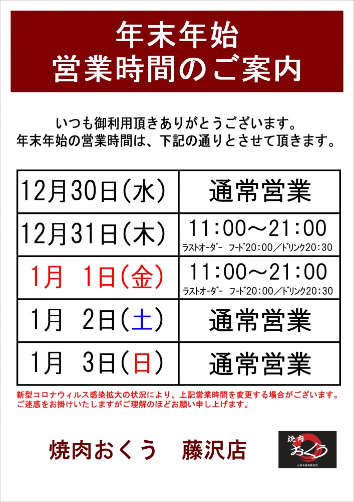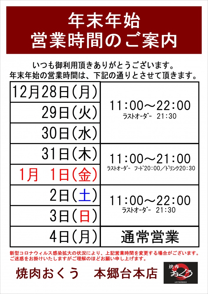 ※ 年末年始営業時間のお知らせ(12/21更新)