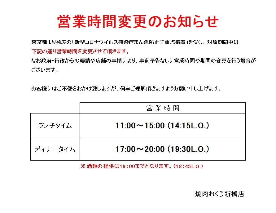 ◆ 新型コロナウィルス感染再拡大防止措置として、政府より飲食店に引き続き営業時間短縮の要請が出されました。それに伴い焼肉おくう全店におきましても、4月21日まで営業時間を短縮させて頂きます。なお政府・行政からの要請や店舗の事情により、事前予告なしに営業時間や実施期間の変更を行う場合がございます。お客様にはご不便をおかけ致しますが、何卒ご理解頂きますようお願い申し上げます。