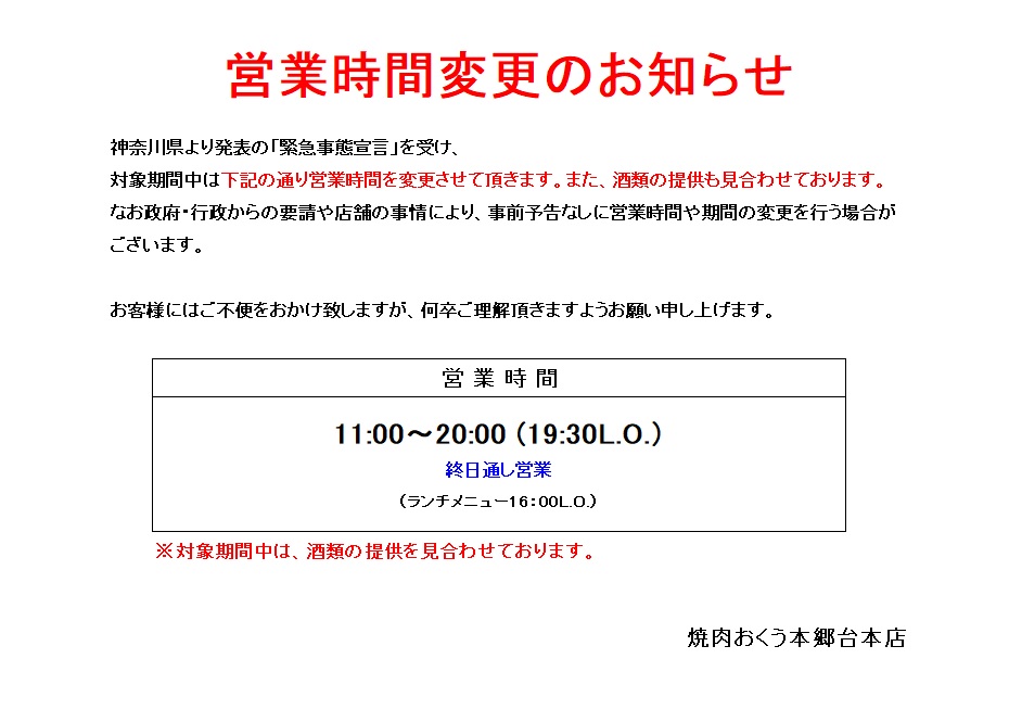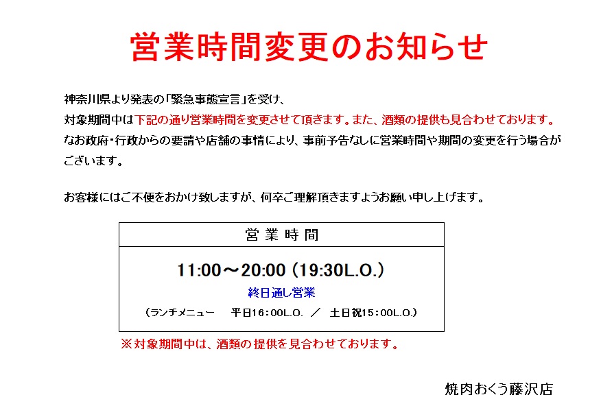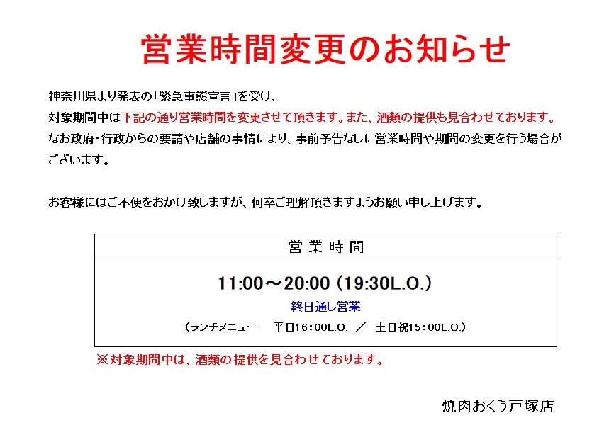 新型コロナウィルス感染拡大防止措置として政府より発表の「緊急事態宣言」に伴い、焼肉おくうにおきましても当面の間、時間短縮営業と酒類提供の見合わせを行っております。なお政府・行政からの要請や店舗の事情により、事前予告なしに営業時間や実施期間・内容の変更を行う場合がございます。お客様にはご不便をおかけ致しますが、何卒ご理解頂きますようお願い申し上げます。7/16より休業しておりました新橋店は8/23より営業を再開しております。皆さまに安心してお食事して頂けるよう感染防止対策を整え、スタッフ一同ご来店をお待ちしております!(9/17更新)