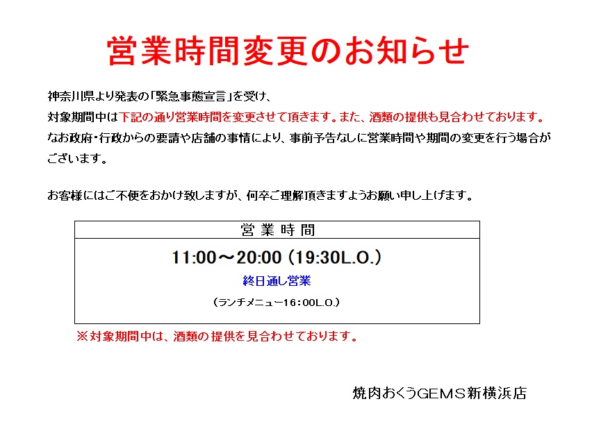 ◆重要◆ 営業時間変更のお知らせ