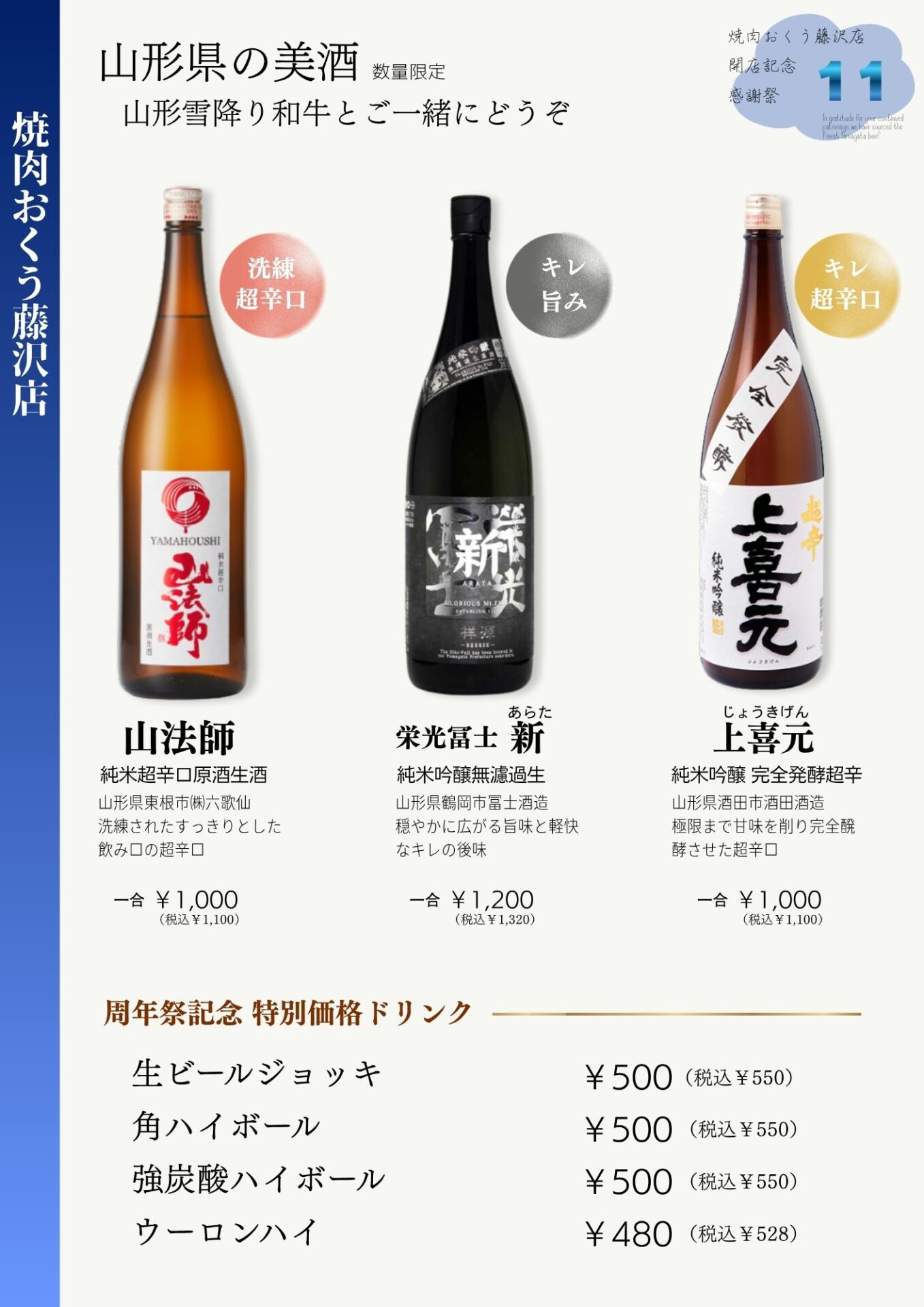 ・山形県の美酒(数量限定): 「山法師」「栄光冨士 新」「上喜元」など、雪降り和牛にぴったりの地酒をご用意