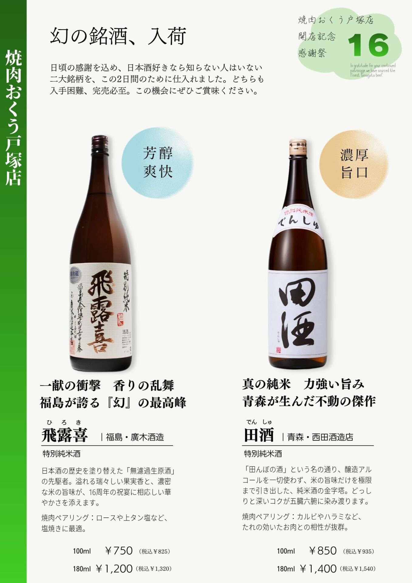 この記念日のために、山形牛の最高峰ともいわれる尾花沢(おばなざわ)の「雪降り和牛」を一頭買いいたしました。極寒の環境で育まれた、きめ細やかなサシと極上の口溶けをぜひご堪能ください。