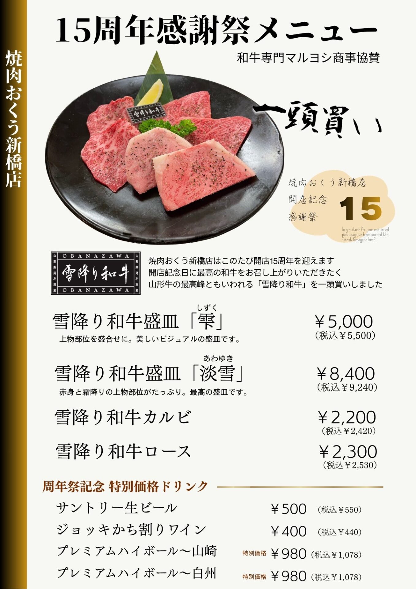 この記念日のために、山形牛の最高峰ともいわれる尾花沢(おばなざわ)の「雪降り和牛」を一頭買いいたしました。極寒の環境で育まれた、きめ細やかなサシと極上の口溶けをぜひご堪能ください。